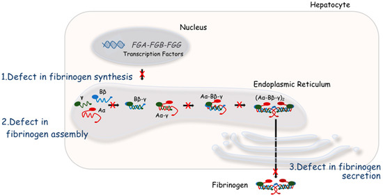 Studies aiming to determine the underlying molecular mechanism by which causative mutations lead to fibrinogen deficiency have been performed in various transfected cell models. This is because fibrinogen is synthesized in hepatocytes, and patient liver biopsies are rarely available to assess the quantity and quality of fibrinogen transcripts, individual chains, folding intermediates, and hexamers. This approach has allowed to functionally characterize defects in mRNA expression, mRNA splicing, fibrinogen assembly, and fibrinogen secretion. However, these simple models cannot fully explore the underlying molecular bases of this pathology and explain the resulting complex clinical manifestations described above.