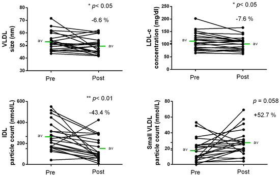 MIT showed a trend towards an increase in small VLDL particle count (+52.7%; p < 0.058) and displayed a significant reduction in IDL particle count (−43.4%; p < 0.01), LDL cholesterol (LDL-c (mg/dL); −7.6%; p < 0.05) and VLDL size (−6.6%; p < 0.05) after the 12-week training program (Table 1 and Figure 1).