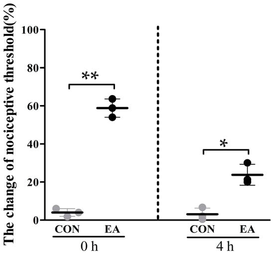 Analgesic effects induced by EA in goats (mean ± SD, %, n = 3). The nociceptive thresholds were measured with potassium iontophoresis. Nociceptive threshold increased at 0 and 4 h after EA stimulation. Goats in the control group were restrained as goats in EA group without needling and electricity. The significance of differences (** p < 0.01, * p < 0.05) was calculated by a t-test. The grey dots represent the control group. The black dots represent EA group.
