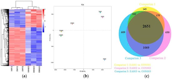 Overview of differentially expressed genes (DEGs). (a) Hierarchical clustering; (b) Principal component analysis; (c) An Venn diagram of DEGs. CON001, CON002 and CON003 were control groups. EA001, EA002 and EA003 were EA groups. Samples from same numbers were twin goats’ the periaqueductal gray.