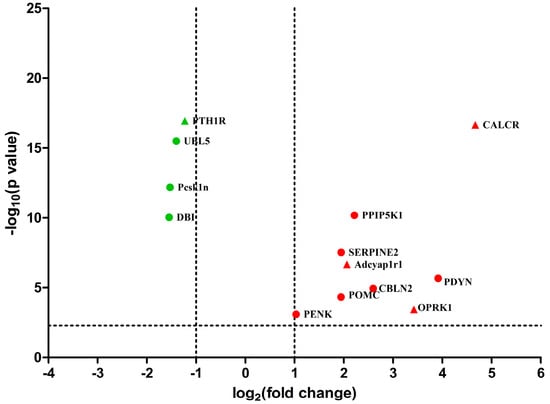 Volcano plot displaying differential expressed neuropeptide and neuropeptide receptor genes between EA and the control group. The y-axis corresponds to the value of log10 (p value), and the x-axis displays the log2 (fold change). The red dots represent the up-regulated neuropeptides genes (p < 0.005). The green dots represent the down-regulated neuropeptides genes (p < 0.005). The red triangles represent the up-regulated neuropeptide receptor genes (p < 0.005). The green triangles represent the down-regulated neuropeptide receptor genes (p < 0.005).