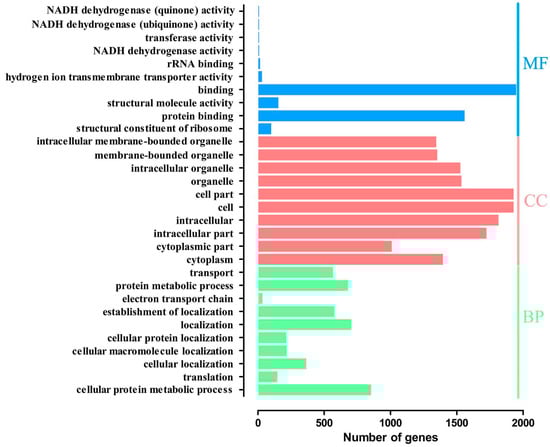 The DEGs involved in enriched functional groups (p < 0.05) were 149 gene ontology (GO) terms (Table S2), containing 60 biological process terms (BP), 72 cellular component terms (CC), and 17 molecular function terms (MF). The ten most enriched categories of DEGs in the GO functional classification are shown in Figure 4. Among these GO terms, seven categories were connected to protein activities, including protein binding, structural constituent of ribosome, transport, protein metabolic process, cellular protein localization, translation and cellular protein metabolic process.