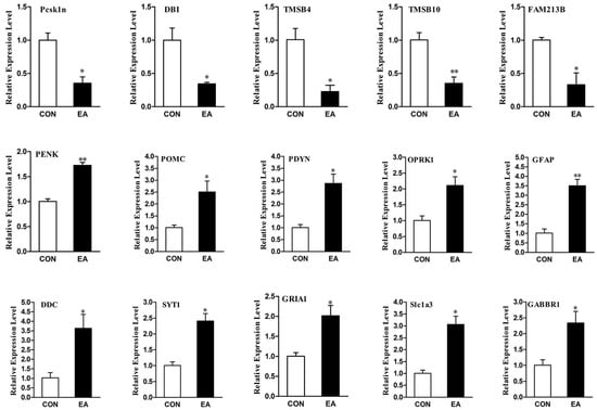 To validate the reliability of the sequencing data with the qRT-PCR, 15 genes (Pcsk1n, DBI, PENK, POMC, PDYN, OPRK1, glutamate receptor 1, excitatory amino acid transporter 1, γ-aminobutyric acid type B receptor subunit 1, thymosin β-4, thymosin β-10, prostaglandin F synthase, Glial fibrillary acidic protein, Aromatic-L-amino-acid decarboxylase and Synaptotagmin-1) were selected. As shown in Figure 5 and Table S3, all validated genes were consistent with the results from deep sequencing. Five genes, including Pcsk1n, DBI, thymosin β-4 (TMSB4), thymosin β-10 (TMSB10) and prostaglandin F synthase (FAM213B) were down-regulated (p < 0.05). Whereas, ten genes, including PENK, POMC, PDYN, OPRK1, Glial fibrillary acidic protein (GFAP), Aromatic-l-amino-acid decarboxylase (DDC), Synaptotagmin-1 (SYT1), glutamate receptor 1 (GRIA1), excitatory amino acid transporter 1 (Slc1a3) and γ-aminobutyric acid type B receptor subunit 1 (GABBR1) were up-regulated (p < 0.05).