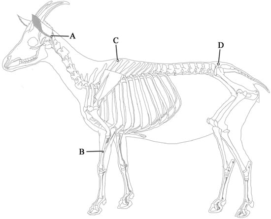 For EA stimulation, the set of Baihui, Santai, Ergen and Sanyangluo acupoints was selected. Here the acupoints were nominated with Pinyin Naming System instead of the Meridian Numbering System because animal’s meridians were not completely recorded. The anatomical locations of these acupoints have been described in detail for veterinary medicine [32,48] and shown in Figure 6. The Baihui acupoint was identified on the dorsal midline between the spinous processes of the last lumbar and the first sacral vertebrae. The Santai acupoint was identified on the dorsal midline between the spinous processes of the fourth and fifth thoracic vertebrae. The Ergen acupoints were identified bilaterally, with each at the pit ventrocaudal to the ear base between the ear base and the cranial border of the transverse process of the atlas on each side. The Sanyangluo acupoints were also identified bilaterally, with each at approximately 5 cm ventral to the lateral tuberosity of the radius in the groove between the common digital extensor and lateral digital extensor muscles of the forelimb. The Ergen and Sanyangluo acupoints on the left side of the body were chosen in this study. Needle insertion and EA were conducted with the method according to previous studies [35]. A pair of wires from one output of the WQ-6F Electronic Acupunctoscope (BeijingXindonghua Electronic Instrument Co., Ltd., Beijing, China) connected needles at Baihui and Santai acupoints. Other pair of wires from the same machine connected needles at Ergen and Sanyangluo acupoints. The frequency and voltage of stimulation were set to 60 Hz and 3.2 V, respectively [36,48]. The goats of EA group were administered EA for 30 min. The goats of control group were restrained in the same manner as goats of EA group without needling and electricity.