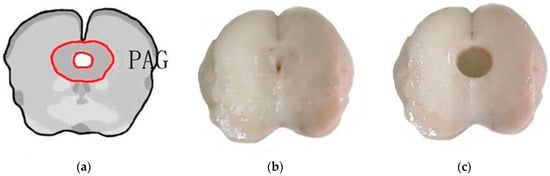 The location of the periaqueductal gray (PAG). (a) The sketch of the PAG location; (b) The brain section containing the PAG; (c) The brain section after sampling.
