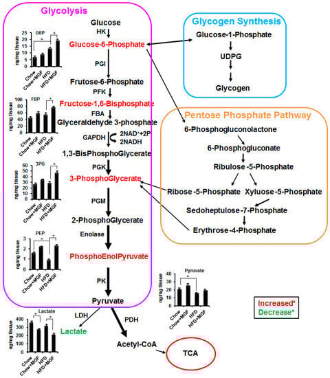 Glucose-6-phosphate is the first metabolite in glucose metabolism. HFD feeding almost doubled glucose-6-phosphate probably due to HFD blunted metabolism at the subsequent metabolic steps, as there was gradually augmented reduction in metabolites from the early steps to the later. Near the end of glycolysis, HFD caused significant reduction in PEP and pyruvate (Table 1, Figure 1). On the contrary, MGF gradually and significantly increased metabolites and the increases were augmented from the early steps to the later (Table 1, Figure 1). These results indicate that MGF is able to counteract the inhibitory effects of HFD on glycolysis.