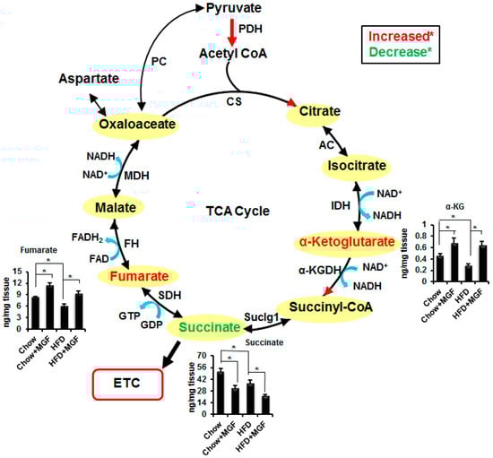 MGF modulates metabolite profiles in the TCA cycle. One-end arrows mean unidirectional and two-end arrows mean bidirectional. Significantly altered metabolites are presented in bar graphs. Values are average ± SEM (n = 6). * p < 0.05. PC, pyruvate carboxylase; PDH, pyruvate dehydrogenase; CS, citrate synthase; AC, Aconitase; IDH, isocitrate dehydrogenase; α-KGDH, α-ketoglutarate dehydrogenase; Suclg, succinyl coenzyme A synthetase; SDH, succinate dehydrogenase; FH, fumarase; MDH, malate dehydrogenase; α-KG, α-ketoglutarate.