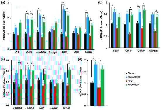 Mitochondrial genes are tightly regulated by several transcription factors including transcriptional factor A (TFAM), nuclear respiratory factor 1 (NRF1) and estrogen-related receptor α (ERRα), and the co-factors of these transcriptional factors, peroxisome proliferator-activated receptor-γ coactivator (PGC)-1α and PGC-1β [21,22,23,24,25,26]. MGF significantly increased all of those transcriptional factors, except ERRα, in chow or HFD-fed mice (Figure 5c), indicating that MGF upregulates those enzymes in the TCA cycle and the ETC at the transcriptional level. PGC-1α is positively correlated to mtDNA. Therefore, we measured mtDNA contents in mitochondria isolated from those muscle tissues. MGF almost doubled mtDNA in both chow and HFD-fed mice (Figure 5d). Together, these results indicate that MGF induces mitochondrial biogenesis.