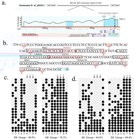 - Wu, W.; Ren, Z.; Liu, H.; Wang, L.; Huang, R.; Chen, J.; Zhang, L.; Li, P.; Xiong, Y. Core promoter analysis of porcine SIX1 gene and its regulation of the promoter activity by CpG methylation. Gene 2013, 529, 238–244. [Google Scholar] [CrossRef] [PubMed]