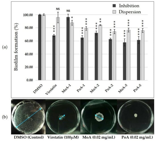 UFAs activity on A. baumannii ATCC 17978 motility and biofilm formation. (a) Inhibition and dispersion of biofilms quantified by crystal violet staining method. 24 h-biofilms were treated with or without virstatin (100 µM), palmitoleic acid (PoA) or myristoleic acid (MoA) at different concentrations (0.01 (UFA-1), 0.02 (UFA-2) or 0.05 (UFA-5) mg/mL) and DMSO as control; (b) Activity on motility. Blue arrows measure the diameter of surface motility. Results are presented as (mean ± standard error of mean). “***” for p < 0.0001, “**” for p < 0.01, “*” for p < 0.05 and “NS” for non-significant difference.
