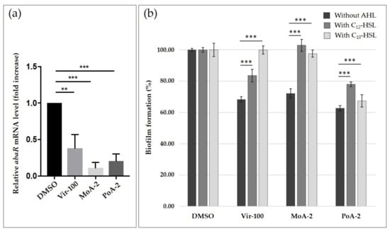 The N-acyl-homoserine lactone (AHL) production in A. baumannii ATCC 17978 or A. baumannii clinical isolates was determined, as described by [28] with P. aeruginosa PAO1 and E. coli ATCC 10536 as positive and negative controls, respectively. To investigate the potential quorum-quenching activity of UFAs and virstatin on short-HSLs, we used the screening platform described by [29]. The effect of the addition of long-HSLs, i.e., N-(3-hydroxydodecanoyl)-dl-homoserine lactone (OH-C12-HSL, Sigma Aldrich) and N-decanoyl-dl-homoserine lactone (N-C10-HSL, Sigma Aldrich) solubilized in DMSO, on biofilms pretreated by virstatin and UFAs was investigated. Five hundred nM of each HSL were added concomitantly to 0.02 mg/mL of UFAs and 100 µM virstatin. DMSO enriched with HSL (500 nM) was used as control. Biofilm formation was quantified and the results significance was analyzed, as described in the previous section. The effect of virstatin and UFAs on abaR gene expression using q-RT-PCR was also investigated. A. baumannii was grown overnight in MH medium and diluted to OD600 of 0.01 and incubated for 24 h under agitation at 37 °C with DMSO (negative control), virstatin (100 μM), MoA (0.02 mg/mL), or PoA (0.02 mg/mL). Total RNAs were extracted using RNeasy-Mini kit (Qiagen, Valencia, CA, USA), followed by a supplementary DNase treatment (Ambion, Carlsbad, CA, USA), and a verification of absence of contaminating DNA by PCR. RNAs were reverse-transcribed using QuantiTect Reverse Transcription Kit (Qiagen). Real-time PCR was performed using Brilliant III SYBR Green QPCR (Agilent Technologies, Santa Clara, CA, USA) with an AriaMx Real-Time PCR System (Agilent Technologies). Specific primers are listed in Table S1. The rpoB expression was used as an internal control for normalization and fold change calculated in relation to the DMSO control. Data were analyzed using Prism Graph Pad 5 with a one-way ANOVA (n = 4).