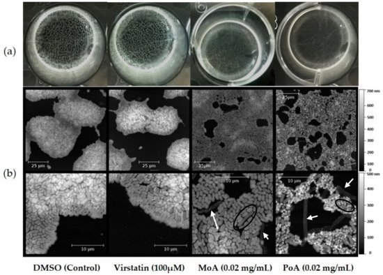 UFAs activity on air-liquid biofilm organization. Pellicles were observed after growth with or without virstatin, PoA or MoA. (a) Visual aspect of pellicle surface after 24 h treatment (b) Atomic Force Microscopy (AFM) images of pellicle water-facing sides after 6 h treatment. From left side to right side: DMSO control, pellicle formation with 100 µM virstatin, with 0.02 mg/mL MoA and with 0.02 mg/mL PoA. Elongated cells with a normal thickness are black encircled and lysed elongated cells are pointed out with white arrows.