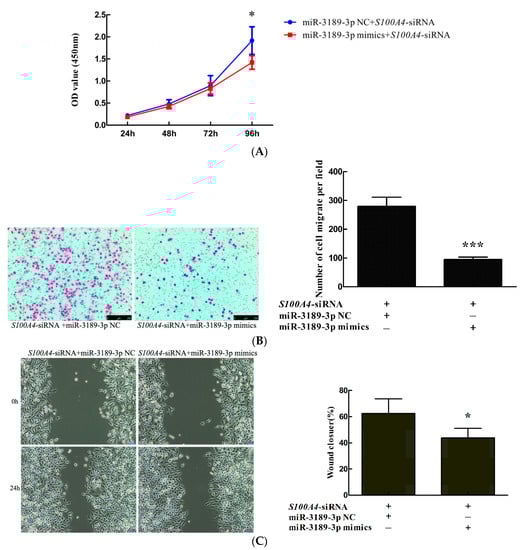 2.4. miR-3189-3p Mimics Enhanced the Effects of S100A4 siRNA on the Inhibition of Proliferation and Migration of MGC803 Cells