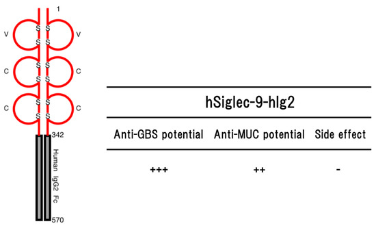 Schematic representation of a soluble form of human Siglec-9 (hSiglec-9-hIg2) consisting of the ectodomain of human Siglec-9 and Fc portion of human IgG2 (left part) and their potential (anti-GBS [79] and anti-MUC [88]) in the transgenic mice are shown (right part). Numbers on the figure are shown amino acids number of each molecule. S represents disulfide bond. ++ to +++ indicate relative strength of the phenotype. − means no phenotype observed.