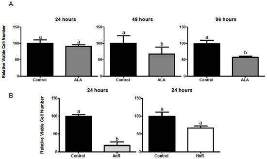 (A) Effect of 100 μM ALA on cell viability after 24, 48 and 96 h treatment. No difference was seen after 24 h of treatment, but significantly fewer total live cells were found after 48 (p < 0.005) and 96 h (<0.05); (B) Effect of ALA combined with EPA and DHA on cell viability after 24 h treatment. The AnR (25 μM ALA:9 μM EPA:78 μM DHA) treatment resulted in significantly fewer live cells compared to control (82.2% reduction; p < 0.01), while the HuR (25 μM ALA:25 μM EPA:62 μM DHA) treatment had no significant effect compared to the control *. * Cell viability is expressed as a % of the control viable cell number. Bars with different letters (a,b) are significantly different from one another (p < 0.05). AnR = animal fatty acid ratio; HuR = human fatty acid ratio; ALA = α-linolenic acid.