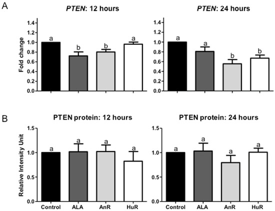 (A) Effect of ALA alone and combined with EPA and DHA on PTEN gene expression. 112 μM ALA and AnR significantly reduced PTEN gene expression following 12 h treatment (ALA fold change = 0.72 ± 0.09, AnR fold change = 0.80 ± 0.1; p < 0.01); no change was seen with HuR treatment. Following 24 h treatment, AnR and HuR significantly reduced PTEN gene expression (AnR fold change = 0.55 ± 0.08; HuR fold change = 0.67 ± 0.06; p < 0.001); no change was observed with ALA treatment. Bars with different letters are significantly different (p < 0.05). Data were normalized to the endogenous control beta-2 microglobulin (B2M) and fold change was calculated with the 2−ΔΔCt method [19]. AnR = animal fatty acids ratio; HuR = human fatty acids ratio; (B) Effect of ALA alone and combined with EPA and DHA on PTEN protein expression. No change in PTEN protein expression was observed following both 12 and 24 h treatment of 100 μM ALA, AnR and HuR. GAPDH was used as the loading control. Bars with different letters (a,b) are significantly different from one another (p < 0.05). AnR = animal fatty acids ratio; HuR = human fatty acids ratio.