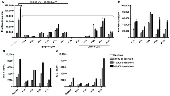 Peripheral blood lymphocytes (PBLs) from healthy individuals had higher proliferation rates when stimulated with increasing concentrations of αCD3/28 beads. In contrast, the majority of ascites-derived T cells hardly proliferated upon αCD3/28 stimulation. Only two patients (P73 and P98) showed a dose–response curve when stimulated with increasing concentration of beads, but proliferation was low compared to PBLs from healthy individuals. Altogether, proliferation of ascites-derived cells was significantly lower when stimulated with 10,000 or 40,000 beads/well compared to PBLs from control individuals (mean difference 50,737 cpm and 63,549 cpm, p < 0.05 and p < 0.01 respectively). The decreased proliferation of ascites-derived T cells was not mediated by the presence of Tregs, as there was no significant difference in the proliferation of sorted CD4+CD25− T cells lacking Tregs and sorted lymphocytes from ascites that contain Tregs.