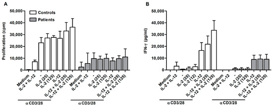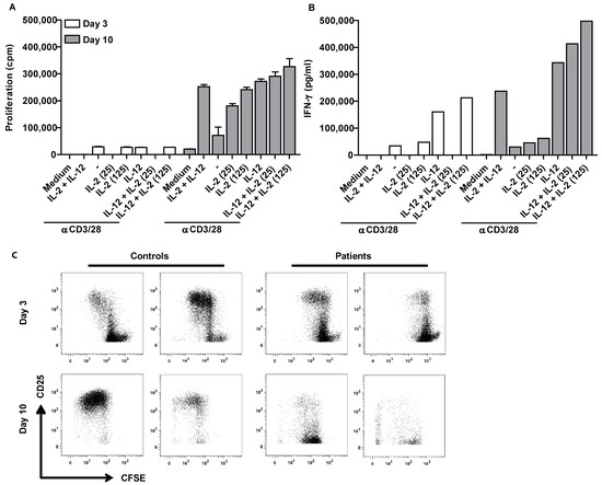 To determine whether the proliferative capacity of ascites-derived T cells can be restored, sorted lymphocytes were stimulated with αCD3/28 beads for three days. Subsequently, a fraction of those cells was cultured for 10 days in the presence of IL-2 and IL-7. After 10 days, the cells were washed and re-stimulated for three days with αCD3/28 in the presence or absence of IL-2, IL-12, or a combination of both cytokines.