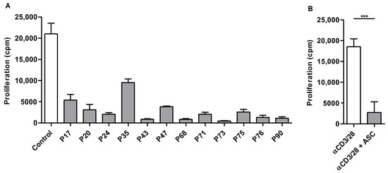 Ascites inhibits proliferation of PBLs from healthy donors: (A) 5 × 104 control PBLs were stimulated with 2500 beads/well in the presence of 20% ascites fluid from ovarian cancer patients. Data are given as mean of cpm 3H-thymidine incorporation of triplicate cultures ± SEM. (B) Summary of PBLs stimulated with αCD3/28 (n = 4) and PBLs stimulated in the presence of ascites (n = 14). Values are given as mean ± SD. Statistical analysis using unpaired student’s t-test with Welch’s correction (*** p < 0.001).