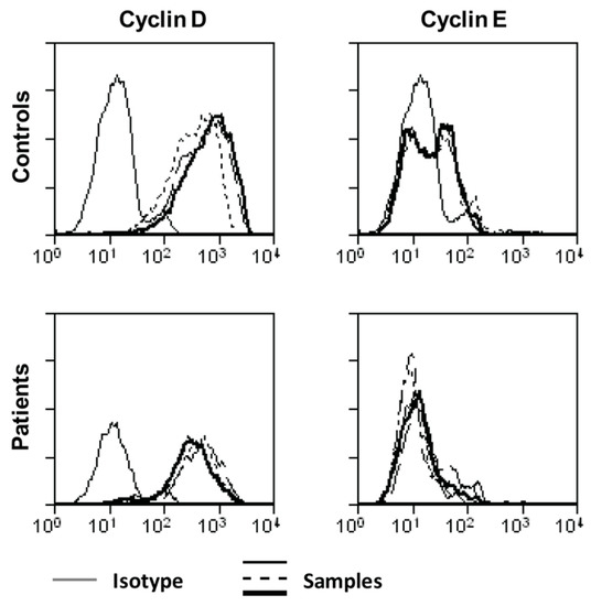 Cyclin D and E expression in control and ascites-derived lymphocytes. Control PBLs or sorted ascites-derived lymphocytes (5 × 105 cells) were stimulated with 20,000 αCD3/28 beads/well. After 48 h, cells were stained for CD4, cyclin D and cyclin E. Plots are representative for three individual controls and four patients.