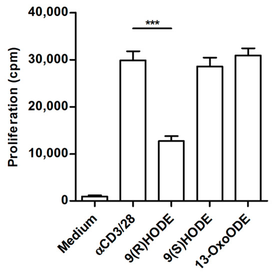Synthetic Lipid-metabolites partially inhibit T cell proliferation. In total, 50,000 control PBLs from healthy donors were stimulated with αCD3/28 for three days in the presence of 9(R)HODE, 9(S)HODE or 13-OxODE. Only 9(R)HODE decreased the proliferation of control PBLs. Data given as mean of cpm 3HTdR incorporation of triplicate cultures ± SEM. Statistical analysis was performed using one-way ANOVA with Bonferroni post-test (*** p < 0.001).