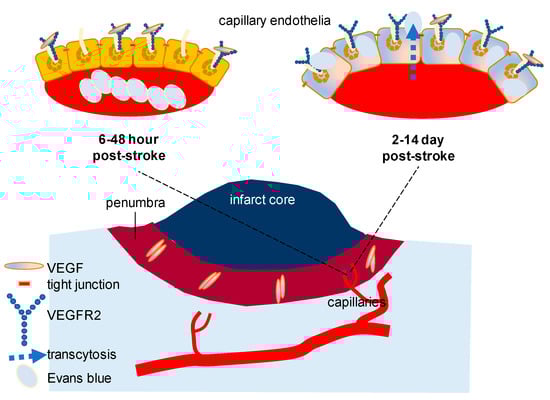 Pathologically, VEGF-induced endothelial permeability can alter BBB. For a small-molecule to cross the intact BBB, the expected molecular mass is less than a 400–500 Da [36]. Recent studies on stroke focusing on VEGF signaling have demonstrated that there is a dynamic alteration of VEGF and VEGF receptor (Figure 1). While a progressive decline of VEGF level is reported in the hippocampus with aging, the importance of VEGF receptor 2 (VEGFR2) expressed in the vascular endothelium has been highlighted in a more complicated pathological circumstance. Using a young adult mouse model of diabetes, it has been convincingly shown that inhibiting VEGFR2 improves functional outcomes and BBB disruption after stroke. Three major points of this study are that (1) the peak concentration of VEGF (the initial 6–48 h) and VEGFR2 (the initial 2–14 days) is detected in a different period after stroke thus inhibition approaches, if applied, should be adjusted based on the peak time of the highest VEGFR2, or in a delayed manner than previously thought; (2) BBB breakdown is due primarily to capillary endothelial transcytosis but not because of the tight junction alteration; and that (3) anti-VEGFR2 should be developed with a more personalized focus in a heterogeneous clinical population such as those patients with diabetes and stroke [32]. Although an inducible VEGFR2 knockout model was used as a validation for VEGFR2 inhibition through SU5416 (semaxanib) and there was a record of failure involving SU5416 in clinical trials in the past for other purposes, the result of this study was sufficient to be conclusive in testing hypothesis. This study has corrected our misunderstanding, if any, of BBB disruption in stroke and other cerebral circumstances with disintegrated barrier function: (1) Without loss or weakening of tight junction molecules in the endothelial cells, transcytosis of the otherwise impenetrable molecules (e.g., Evans blue, molecular weight 960.8 Da) is achievable to significantly increase the permeability of the cerebral capillaries in the presence of swelling or edema; (2) β-arrestin dependent endocytosis, which is known to be pivotal in vascular endothelial cadherin (VE-cadherin)-mediated endocytosis might not be the sole mechanism of VEGF-induced permeability in the cerebral capillaries [33], especially, during stroke with diabetes [32].