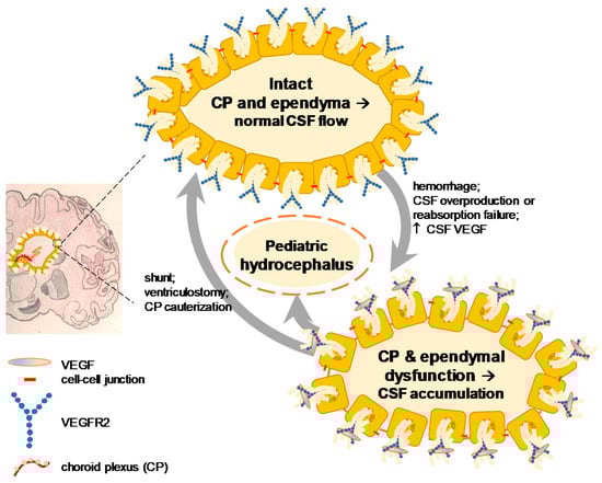 Role of VEGF signaling in post-hemorrhagic hydrocephalus from young individuals: pediatric patients with hydrocephalus have shown an elevated CSF VEGF up to 1 ng/mL [43] and that the infusion of the same dose VEGF into young adult rats results in experimental hydrocephalus. VEGF is considered pathologically causative and anti-VEGF therapy has been proposed [16]. CP, choroid plexus; CSF, cerebrospinal fluid.