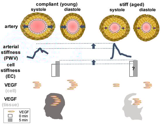 An increase of VEGF contributes to an increase of endothelial cell stiffness at an instantaneous time period of minutes: left—a temporal increase of cell stiffness is exhibited to be a response to external force or shear stress in aortic endothelial cells [111]. Cellular stiffness quantified by the number of focal adhesions in endothelial cells (ECs) before (zero minutes) and after applying force (five minutes) is shown in simplified bars [111]. An increase of VEGF is reported to contribute to an increase of extracellular matrix stiffness of tumor endothelial cells in vitro [112]; right—vascular stiffness measured by pulse wave velocity (PWV) has been known to significantly increase in normal healthy individuals over aging [113], while VEGF levels, for example, in the brain decrease with increasing age at tissue level [2]. Illustration is modified from [114,115,116]. A question mark denotes the interpretation by present authors based on previous reports about changes in vascular stiffness at cellular level over a long period of aging [113,117] that needs a further clarification.