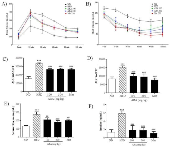 Effects of ARA on glucose metabolism. (A) oral glucose tolerance test (OGTT); (B) intraperitoneal insulin tolerance test (IITT); (C) AUC in OGTT; (D) AUC in IITT; (E) fasting serum glucose; (F) serum insulin. Results are presented as means ± standard errors of the mean (SEM) (n = 5). *** p < 0.001 versus normal chow fed controls (the ND group); ### p < 0.001, ## p < 0.01 versus the high fat diet fed mice (the HFD group). AUC, area under the curve.