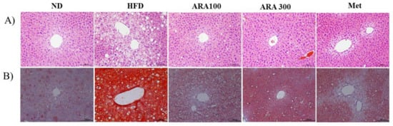 Mice in the HFD group showed intense lipid accumulation in liver as determined by hematoxylin and eosin (H&E) and oil-red-O staining. ARA and metformin both decreased lipid accumulation (Figure 3A,B). Liver function enzymes, serum alanine aminotransferase (ALT) and aspartate aminotransferase (AST), were significantly increased by HFD group versus ND controls, but ARA treatment decreased HFD-induced serum levels. Serum total cholesterol (TC) levels were also significantly increased by HFD, but ARA treatment at both doses significantly reduced these increases. Serum alkaline phosphatase (ALP), triglycerides (TG) and high-density lipoprotein cholesterol (HDL-C) levels were unaffected by the HFD (Table 1).