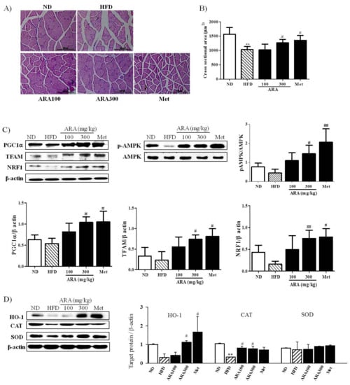 Effects of ARA on energy metabolism in skeletal muscle. (A) muscle fiber morphologies of gastrocnemius muscle, original magnification 400×, Scale bar: 50 µm.; (B) cross-sectional area of muscle fibers; (C) PGC1α, TFAM, NRF1 and pAMPK protein levels in skeletal muscle tissues; (D) HO-1, SOD and CAT protein levels in skeletal muscle tissues. Results are presented as means ± standard errors of the mean (SEM) (n = 3). ** p < 0.01 versus normal chow fed controls (the ND group); ## p < 0.01, # p < 0.05 versus the high fat diet fed mice (the HFD group). PGC1α, peroxisome proliferator-activated receptor gamma coactivator 1 alpha; TFAM, mitochondrial transcription factor; NRF1, nuclear respiratory factor 1; AMPK, adenosine monophosphate-activated protein kinase; HO-1, Heme oxygenase-1; SOD, superoxide dismutase; CAT, Catalase.