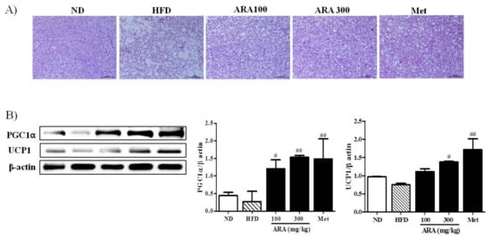 Effects of ARA on energy metabolism in brown fat. (A) hematoxylin and eosin staining in brown adipose tissues, original magnification 100×, Scale bar: 200 µm; (B) PGC1α and UCP1 protein levels in brown adipose tissues. Results are presented as means ± standard errors of the mean (SEM) (n = 3). ## p < 0.01, # p < 0.05 versus the high fat diet fed mice (the HFD group). UCP1, uncoupling protein.