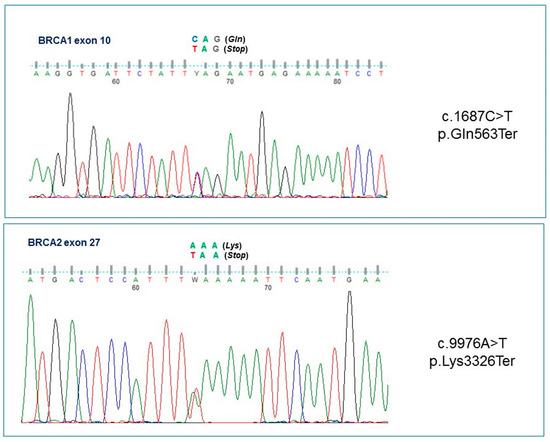 Molecular analysis of the proband showed BRCA1 c.1687C>T (p.Gln563Ter, rs80356898) and BRCA2 c.9976A>T (p.Lys3326Ter; K3326*, rs11571833) heterozygous mutations bearing in both cases a premature stop codon in BRCA1 at exon 10, and BRCA2 at exon 27, respectively (Figure 1). The mutations recurred by genetic transmission to the patient’s asymptomatic daughters (Figure 2): the first, namely a 36-year-old (IV.1) inherited both BRCA1 and BRCA2 mutations; whereas the younger, aged 30 (IV.3) showed only the BRCA2 variant. The proband’s asymptomatic 91-year-old mother (II.9) bore only the mutation in BRCA1 in a similar fashion to the sister with breast cancer who died at 56 years of age (III.3), and for whom the analysis was performed on formalin-fixed, paraffin-embedded (FFPE) tissue. Mutational analysis, which turned out to be negative, was later extended to the proband’s 70-year-old husband, since he was reported as having a degree of relationship (first-degree cousins) with his mother (II.7), who died of breast cancer at the age of 70, and with the maternal grandmother of the proband (I.3), who died also at the age of 70 of breast cancer.