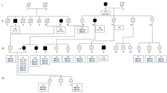 Genetic testing was also performed in other consenting relatives, and the following data refer to the presence of germinal BRCA1 or BRCA2 gene mutation. The mother’s sister had died at 60 years of age for a metastatic ovarian cancer (II.10) one year earlier. She had three children: a 53-year-old son (III.4), who had received a diagnosis of cutaneous melanoma two years before, but with no mutations; a 51-year-old daughter (III.5) carrying no mutations; and an asymptomatic 48-year-old daughter (III.6) positive to the mutation of the BRCA1 gene. An additional sister of the mother’s proband (II.11) died at 80 years of age for causes unrelated to cancer, while her son died at 55 years of age of pancreatic cancer (III.9). Two other sons of 70 (III.7) and 64 (III.8) years of age were apparently asymptomatic, but both of them bore mutations in the BRCA1 gene. Furthermore, three more cousins, daughters of the asymptomatic 80-year-old sister of the mother’s proband (II.13) of 57 (III.13), 55 (III.14) and 45 (III.15) years of age, were negative to the mutational analysis.