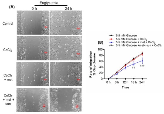 Metformin impairs cell migration in HUVEC exposed to euglycemia and CoCl2. (A) HUVEC were incubated for 24 h with euglycemia in the presence or absence of metformin. Scratch lines were created on confluent monolayers. The media containing different glucose concentrations and metformin were replaced. Then cells were incubated with CoCl2 for 24 h in a 5% CO2 chamber that was connected to CCD camera. Images were acquired every hour, and three independent biological experiments were performed at which each condition was assessed in duplicate. The scratch area was measured using NIS Elements software. (B) CoCl2 induction exhibited no significant effect on cell migration under euglycemia, whereas metformin reduced migration after 18 h. Sunitinib (0.1 µmol/L) was used as a negative control, therefore the line with sunitinab is on x axis as cell migration not affected. Results are expressed as mean ± SEM and were analyzed by one-way ANOVA followed by LSD, ## p < 0.01, ### p < 0.001 compared pairwise, i.e., the metformin-treated versus metformin-untreated condition. Scale bar is 100 µm. Key: met: metformin; sun: sunitinib.