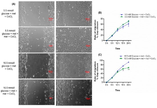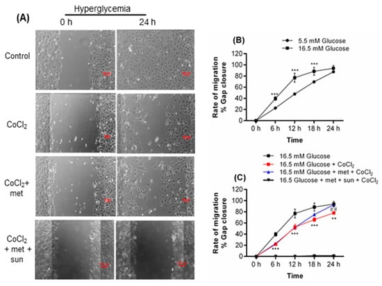 Metformin reduced cell migration under euglycemia-CoCl2 at 18 (p < 0.01) and 24 h (p < 0.001, Figure 1B) of CoCl2 but accelerated cell migration under hyperglycemia-CoCl2 at 24 h of CoCl2 (p < 0.01, Figure 2C).