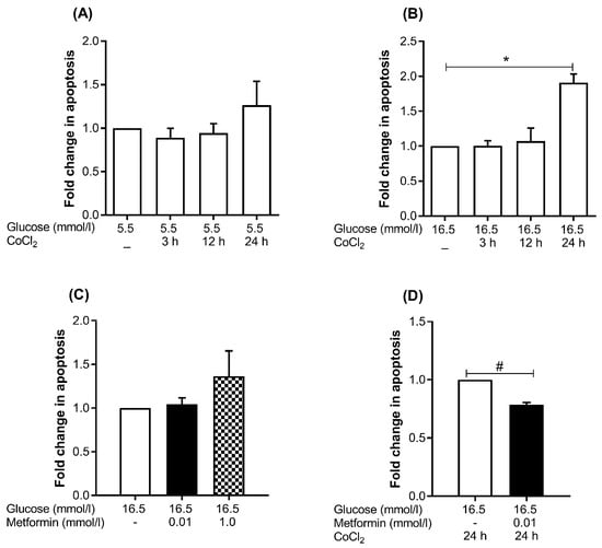 Metformin significantly reduced the apoptosis (−1.3-fold, p = 0.045) under hyperglycemia-CoCl2 at 24 h of CoCl2 (Figure 3D). However, metformin concentration exhibited no effect on HUVEC apoptosis under euglycemia-CoCl2 at 3, 12, or 24 h of CoCl2 or under hyperglycemia-CoCl2 at 3 and 12 h of CoCl2 (Figure S1). A supra-physiological concentration of metformin (1.0 mmol/L) non-significantly enhanced apoptosis (1.3-fold, p > 0.05) in HUVEC treated with hyperglycemia for 48 h (Figure 3C).