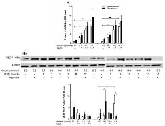In WB, metformin exhibited no significant effect on VEGF 165A protein expression under euglycemia-CoCl2. However, under hyperglycemia-CoCl2, metformin significantly increased VEGF 165A protein level at 1 h of CoCl2 (7.7-fold, p = 0.012), whereas the level decreased at 12 h of CoCl2 (−5.2-fold, p = 0.019) versus parallel conditions without metformin (Figure 4B).