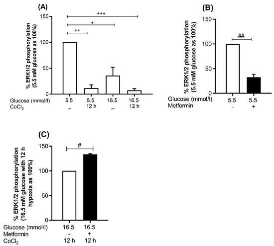 Effect of metformin on the activity of MAPK pathway. HUVEC were treated with euglycemia or hyperglycemia in the presence or absence of metformin for 48 h, and parallel cultures were exposed to CoCl2 for 12 h. (A) Represents % of ERK1/2 phosphorylation (B) Effect of metformin on euglycemia, and (C) hyperglycemia combined with 12 h chemical hypoxia CoCl2. Percentage of phosphorylation indicates relative intensity of phospho-protein/total protein. The variation in protein expression levels was assessed by flow cytometry on three independent biological replicates. Results are presented as mean ± SEM and were analyzed using paired t-test. * p < 0.05, ** p < 0.01, *** p < 0.002 compared to the control. # p < 0.05, ## p < 0.01 compared pairwise, i.e., metformin-treated condition versus untreated condition.