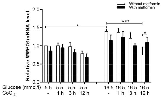 Effect of metformin on MMP16 mRNA expression in euglycemic and hyperglycemic conditions with CoCl2 induction. The variation in RNA expression levels of MMP16 was assessed by qRT-PCR on three independent biological replicates. Results are presented as mean ± SEM and were analyzed using one-way ANOVA followed by LSD. * p < 0.05, *** p < 0.001 compared to the control or hyperglycemia or pairwise, i.e., metformin-treated condition versus untreated condition.
