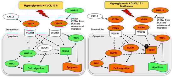 In conclusion, our in vitro study demonstrates that the effect of metformin in acute hyperglycemia-chemical hypoxia model is mediated through restoring VEGFA pathway. This occurs through upregulation of VEGFR1 and VEGFR2, leading to dual effect on activation of cell migration through MMP16 and ROCK1 upregulation, in addition to inhibition of apoptosis by increase in phospho-ERK1/2 and FABP4, components of VEGF signaling cascades.
