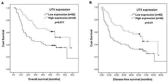 The correlations of patients’ survival with clinicopathological parameters and UTX expression are summarized in Table 3. By log-rank tests, 7th edition AJCC stage I (p = 0.008), T classification, T1/2 (p = 0.013), N classification, N0 (p < 0.001), negative surgical margin (p = 0.015), and high UTX expression (p = 0.011, Figure 2A) were associated with superior OS. Furthermore, 7th AJCC stage I (p = 0.002), T classification, T1/2 (p = 0.022), N classification, N0 (p < 0.001), and high UTX expression (p = 0.01, Figure 2B) were associated with better DFS.