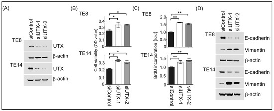 TE8 and TE14 cells transfected with a negative control or UTX-siRNA were harvested and homogenized in RIPA (Radio-Immunoprecipitation Assay) lysis buffer, containing protease inhibitor cocktail on ice for 30 min. The homogenate was centrifuged at 4 °C at 15,000 rpm for 30 min, and lysates were collected. Protein concentration was determined using the BCA Protein Assay kit (Thermo Fisher, Waltham, MA, USA). The cell lysates were subjected to the 10% SDS-PAGE gels for following western blotting. The primary antibodies (anti-UTX, anti-E-cadherin, anti-Vimentin, and anti-β-actin) were obtained from Cell Signaling Technology (Danvers, MA, USA). Horseradish peroxidase (HRP)-conjugated secondary antibodies were obtained from Sigma (St. Louis, MO, USA).