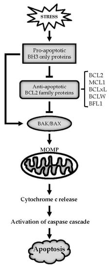 The intrinsic apoptosis pathway is mediated by the B cell lymphoma 2 (BCL2) family of proteins [13]. The BCL2 family, whose namesake was initially identified due to chromosomal translocations that activated BCL2 gene expression [14], has been identified through their composition of a series of shared BCL2 homology (BH) motifs (BH1, BH2, BH3, and BH4). Importantly, only the BH3 motif, which mediates protein–protein interactions between the family members, is strictly conserved across all family members. These proteins are divided into three major subfamilies based on their function and structure: the anti-apoptotic BCL2 proteins (BCL2, MCL1: myeloid cell leukemia 1; BCLxL: B-cell lymphoma extra large; BCLW: BCL2-like protein 2, and BFL1: BCL2-related protein A1), the pro-apoptotic effectors (BAK: BCL2 homologous antagonist/killer; BAX: BCL2-associated X; and BOK: BCL2-related ovarian killer), and the pro-apoptotic BH3 only proteins [15]. The BH3 only proteins can be subclassified into direct activators and sensitizers based on their binding ability to other BCL2 family members [13]. The direct activator BH3 only proteins (e.g., BID: BH3 interacting-domain death agonist and BIM: BCL2-like protein 11) can interact with both the anti-apoptotic BCL2 proteins and the effectors BAK/BAX while the sensitizer BH3 only proteins (e.g., BAD: BCL2-associated death promoter; NOXA: Phorbol-12-myristate-13-acetate-induced protein; and PUMA: p53 upregulated modulator of apoptosis) preferentially bind to the anti-apoptotic BCL2 proteins and thereby indirectly activate BAK/BAX [13]. Cell fate is determined by the balance between the activities of pro-apoptotic and anti-apoptotic BCL2 family members. Under normal cellular homeostasis, the anti-apoptotic members directly bind to the effectors BAK/BAX to counteract their ability to induce apoptosis. However, following cellular stress, such as that induced by radiation or treatment with cytotoxic agents, the BH3 only members are activated. These in turn directly activate BAK/BAX and/or neutralize the function of the anti-apoptotic BCL2 family members by competing for their binding with BAK/BAX. As a result, the effectors BAK/BAX oligomerize in the mitochondrial outer membrane and form pores. The resulting mitochondrial outer membrane permeabilization (MOMP) results in cytochrome c release, activation of downstream caspases, and finally cell death. In addition to their regulation of mitochondrial apoptosis, mediated by the crosstalk among BCL2 family members, BCL2 family proteins have also been shown to induce apoptosis via their regulation of Ca2+ signaling [16,17]. A simplified intrinsic apoptosis pathway is highlighted in Figure 1. For more details see [13,15].