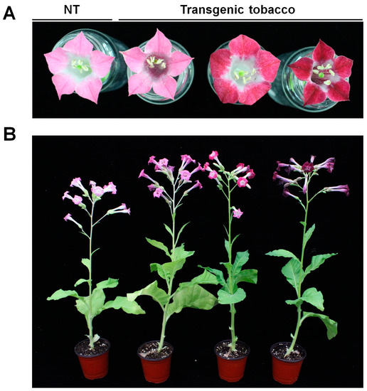 - Lim, S.H.; Sohn, S.H.; Kim, D.H.; Kim, J.K.; Lee, J.Y.; Kim, Y.M.; Ha, S.H. Use of an anthocyanin production phenotype as a visible selection marker system in transgenic tobacco plant. Plant Biotechnol. Rep. 2012, 6, 203–211. [Google Scholar] [CrossRef]