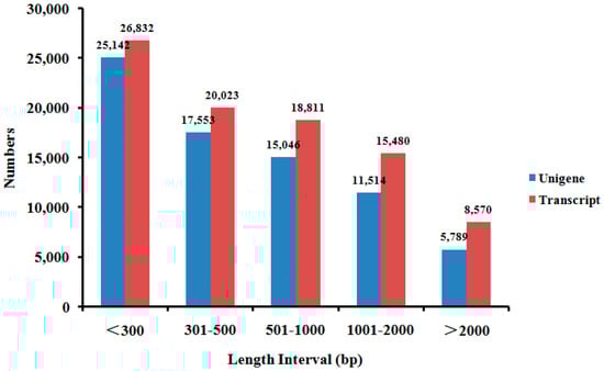 To establish the F. proliferatum transcriptome in the absence of a reference genome, the clean reads of KS_1 were mapped against the tomato genome [25]. A total of 24,453,586 clean reads did not map to the tomato genome. The clean reads of KC were consequently further pooled, yielding a total number of 61,544,598 reads, which were then used to perform the Trinity program for the de novo assembly of the F. proliferatum reference transcriptome. This analysis yielded 89,716 transcripts expressed from 75,044 unigenes (Table 2). The length of the unigenes ranged from 201 to 17,632 bp, with an N50 length of 1283 bp, a mean length of 767 bp and a median length of 419 bp. The transcript and unigene length distribution is shown in Figure 2. Around 26.80% of the transcripts were longer than 1 kb. To assess the quality of the sequencing and de novo assembly, all the assembled clean reads were mapped onto the F. proliferatum reference transcriptome. Mapping ratios of 93.31% and 74.65% were obtained for KC and KS_1, respectively.