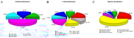 Species distribution of F. Proliferatum unigenes. (A) Similarity distribution of top Basic Local Alignment Search Tool (BLAST)hits for each unigene; (B) e-value distribution of BLAST hits with a cut off e-value of 1 × 10−5; (C) Species distribution for top BLAST hits in the Nr database.
