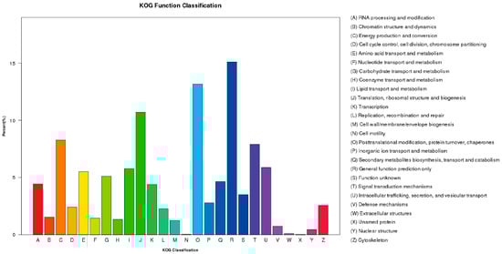 After the GO analysis, the unigenes were assigned to the KOG database for a functional prediction and classification. A total of 24,338 unigenes were grouped into 26 KOG classifications (Figure 4). A high percentage of unigenes was assigned to the KOG’s general function prediction (3674, 15.09%) category, followed by the following categories: posttranslational modification, protein turnover, chaperones (3206, 13.17%), translation, ribosomal structure and biogenesis (2604, 10.69%), energy production and conversion (2014, 8.27%), and signal transduction mechanisms (1924, 7.90%).