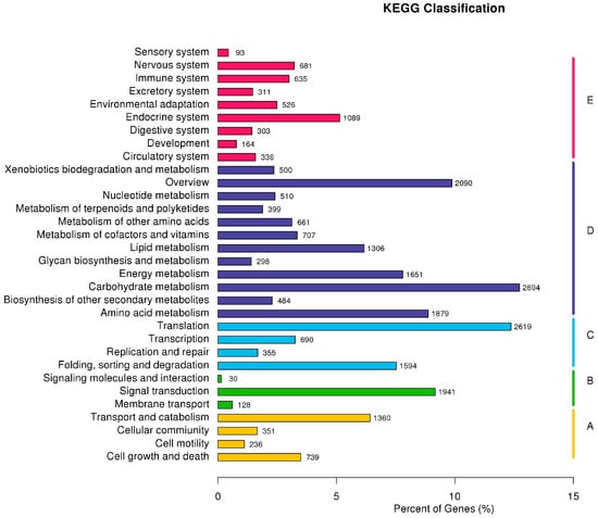 Pathway assignment based on the Kyoto Encyclopedia of Genes and Genomes (KEGG). (A) Classification based on cellular processes categories; (B) classification based on environmental-information processing categories; (C) classification based on genetic-information processing categories; (D) classification based on metabolism categories; and (E) classification based on organismal-system categories.