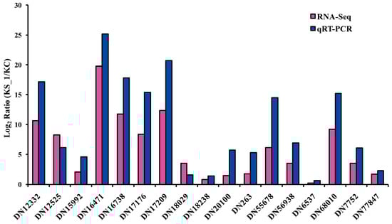 Our transcriptome analysis provides a further view on the expression of F. proliferatum genes at 96 hpi. However, it is worth pointing out that our RNA-seq analyses were generated from two treatments, one from KS_1 and the other from KC. As a consequence, the interpretation of the transcriptome data may be potentially biased. To confirm the RNA-seq profiles, quantitative real-time PCR (qRT–PCR) was used to examine 17 randomly selected genes using three independent biological replicates of KS_1 and KC (Figure 6). The fold change (log2 ratio) was used to validate the results when comparing qRT–PCR gene-expression levels with the RNA-seq gene FPKM (fragments per kilobase of exon per million fragments mapped) values (Table S3). The result indicated that the unigenes’ expression profiles obtained from the two approaches were basically consistent.